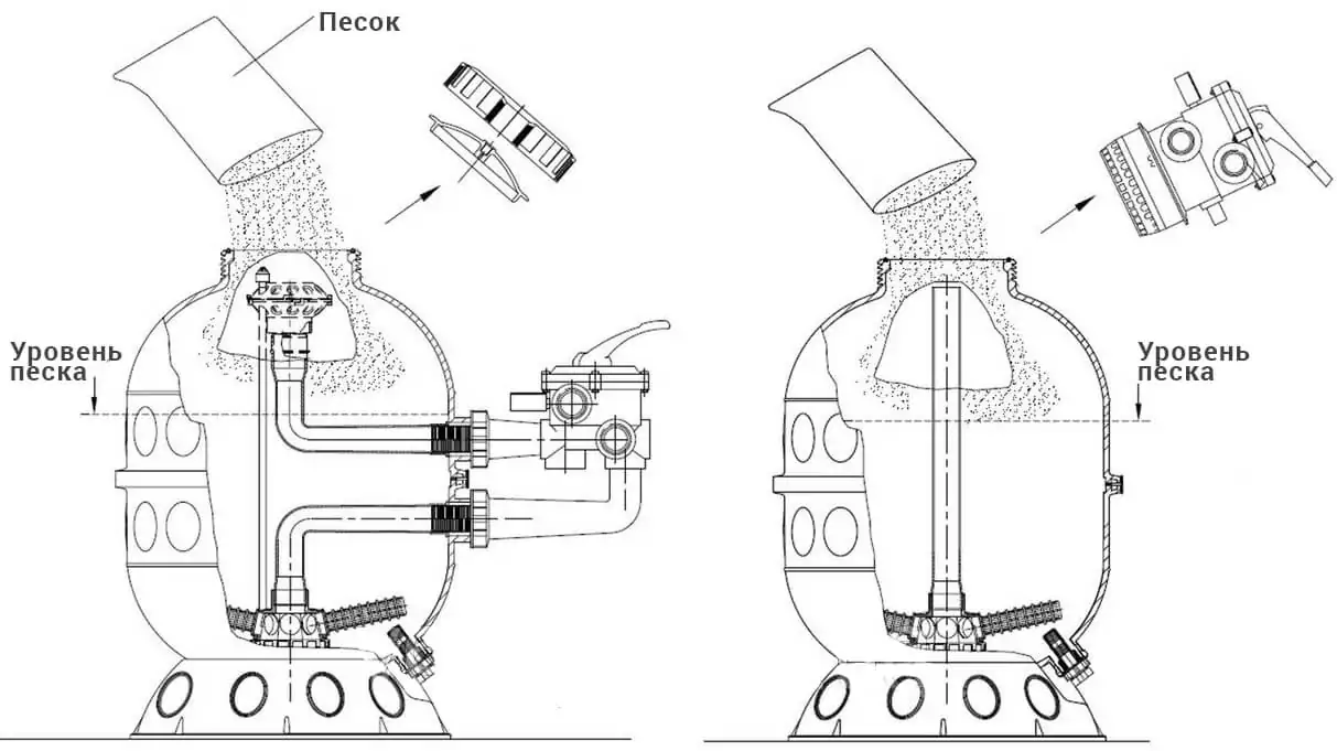 Вода в песчаный фильтр Kripsol AK 520 подается под давлением при помощи насоса. Насос необходимо подбирать в зависимости от пропускной способности фильтра для его правильной работы. Переключение режимов фильтрации осуществляется с помощью шестипозиционного крана. Стоит помнить, что переключать режимы можно только после выключения насоса.