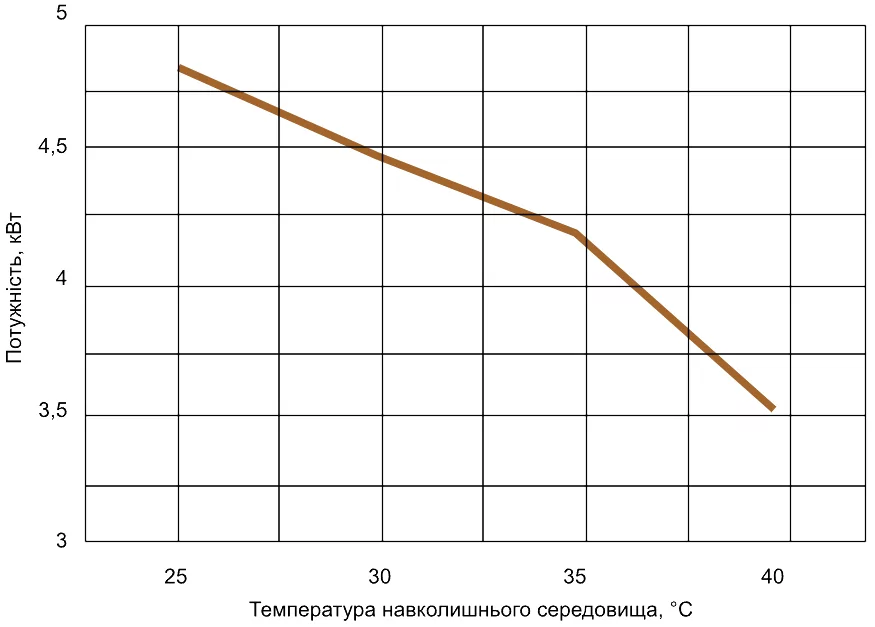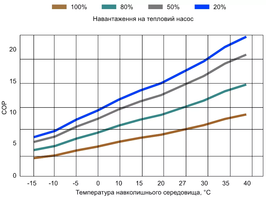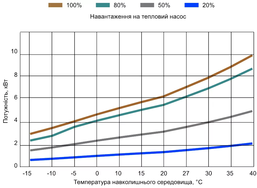График, который показывает, как изменяется тепловая мощность (теплопродуктивность) и эффективность (COP) теплового насоса в зависимости от температуры окружающей среды.