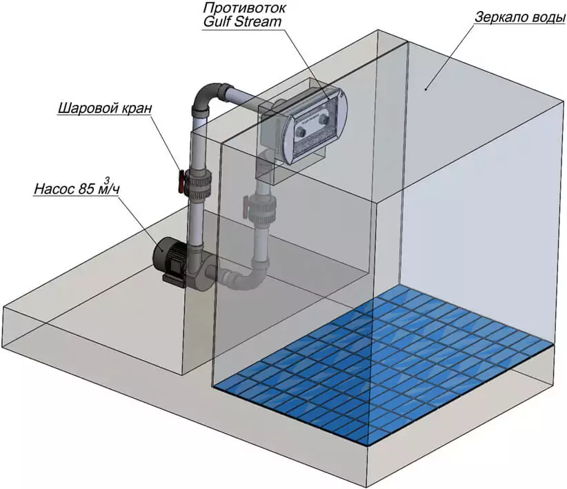 Помимо лицевой и закладной панели для функционирования противотока необходимо подобрать циркуляционный насос (можно без префильтра), блок управления противотоком и комплект фитингов. Диаметр комплекта фитингов подбирается в соответствии с диаметром насоса противотока.