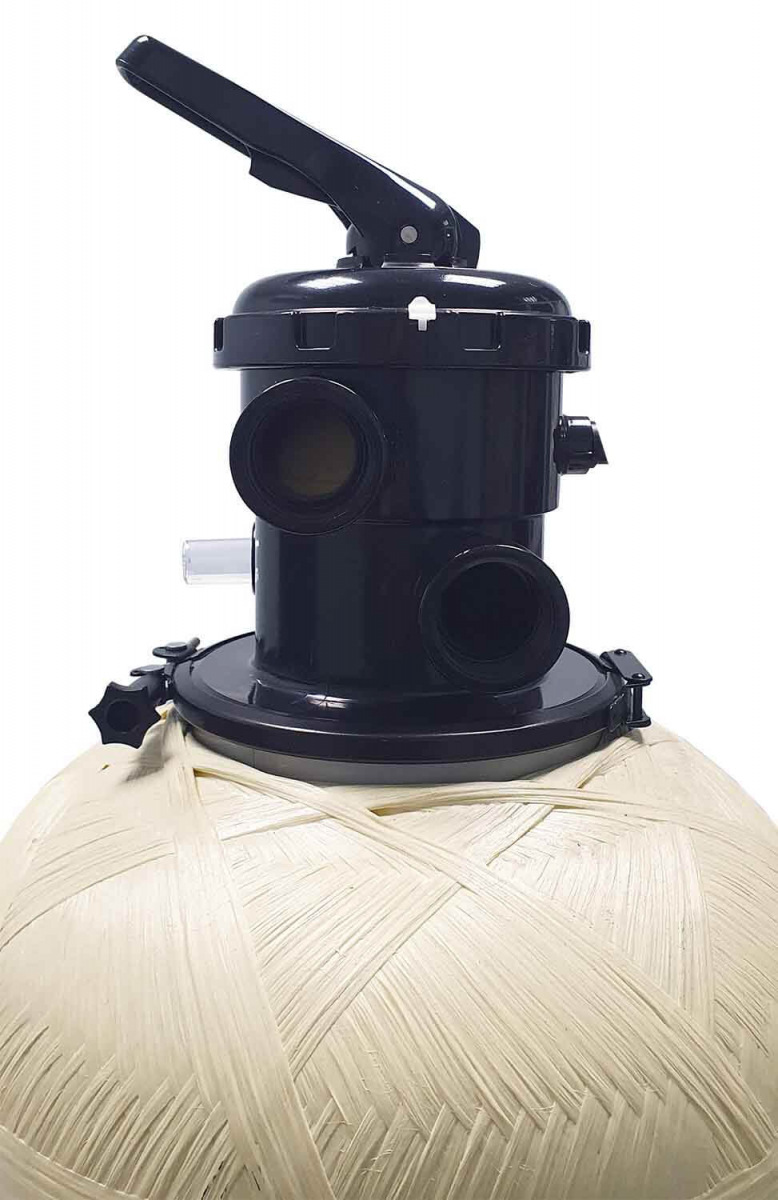 6-позиционный клапан фиксируется к корпусу обжимным хомутом, соединение герметизируемое резиновым уплотнительным кольцом. На корпусе клапана установлен манометр для проверки загрязнения фильтровальной засыпки и смотровое окно для контроля обратной промывки. В качестве фильтрующего материала необходимо применять специализированный кварцевый песок или AFM стеклянную засыпку. Фильтрационный материал из кварцевого песка необходимо менять каждые 8–12 месяцев эксплуатации фильтра. В случае применения AFM, ее замена не требуется.