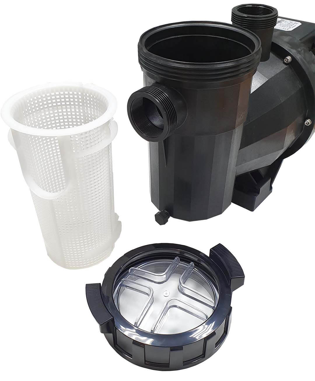 Моноблочный циркуляционный насос с префильтром для системы фильтрации бассейна объемом до 45 м3. Самовсасывающий насос, может быть установлен выше или ниже уровня воды +/- 2 м. Блок префильтра улавливает мусор от 2 мм и более для защиты гидроблока от механических повреждений. Прозрачная крышка корзин позволяет легко контролировать степень загрязнения и необходимость ее чистки.