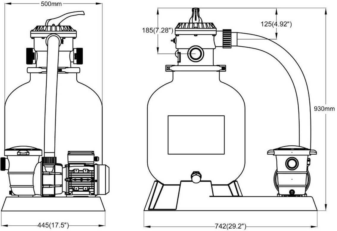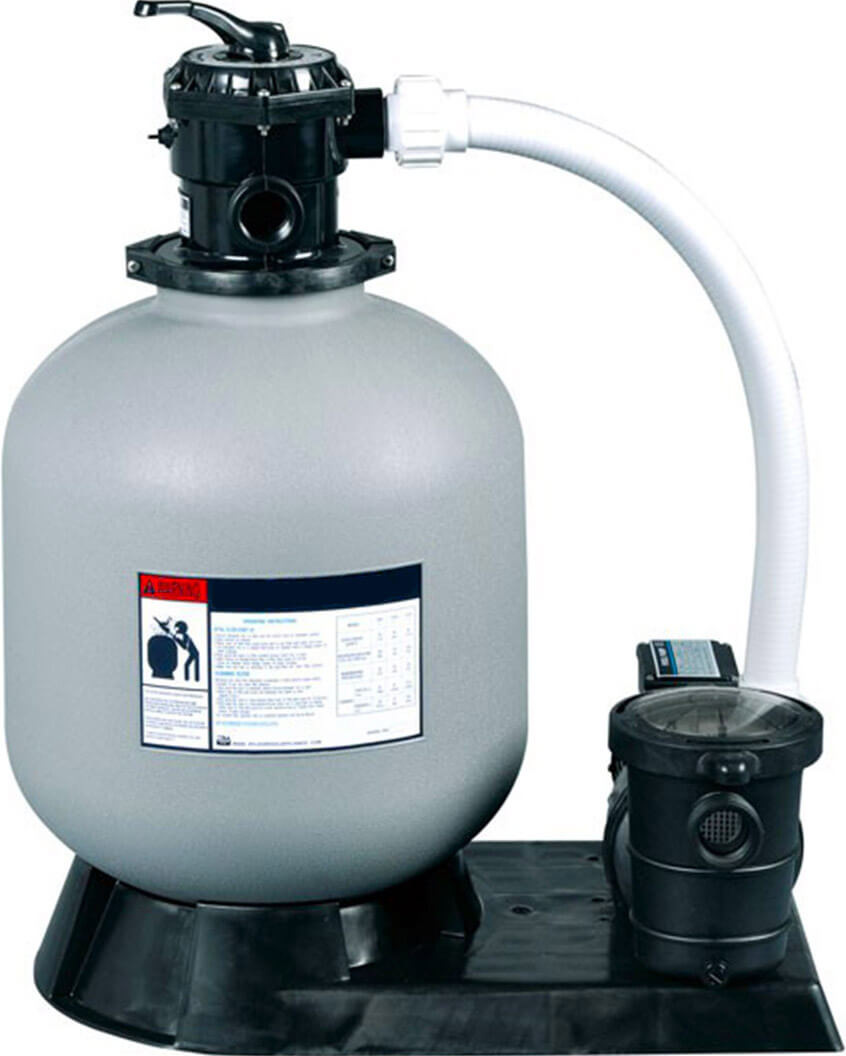 Фильтрационная установка для очистки воды в бассейне объемом до 46 м3. Станция укомплектована песчаным фильтром, циркуляционным насосом, семи позиционным клапаном, манометром, соединительным шлангом. Все компоненты размещены на платформе.