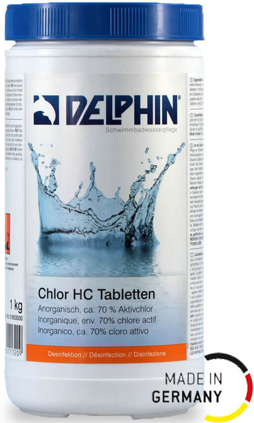 Для полного обеззараживания воды в бассейне необходимо внести Delphin HC неорганический хлор длительного действия в таб (20г), 1кг с расчетом 2-4 таблетки на 10 м3 воды один раз в две недели.