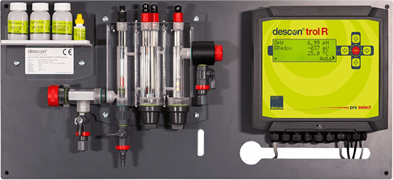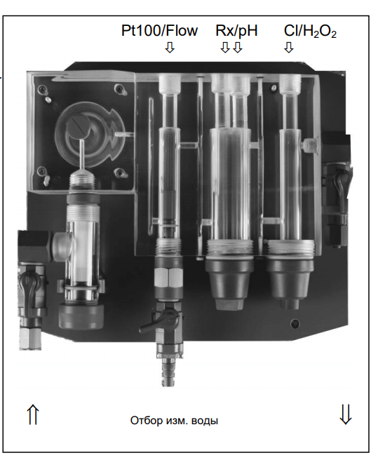 Измерительная ячейка Descon 0410 B имеет 3 раздельные, очищаемые камеры для установки электродов, которые измеряют свободный хлор, Redox и pH. Ячейка оснащена температурным датчиком и датчиком контроля измерительной воды.