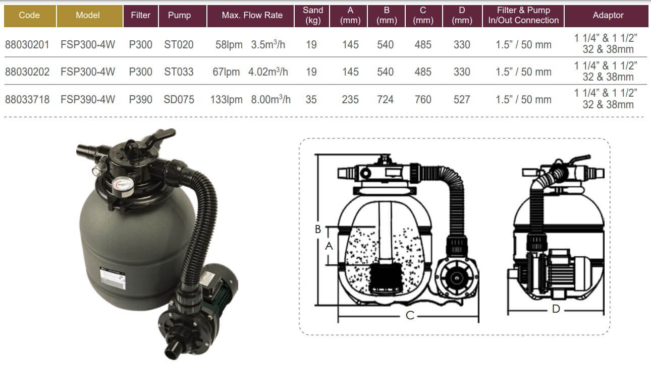 Комплект состоит из песчаного фильтра, 4х позиционного клапана, циркуляционного насоса без префильтра Emaux ST033 и соединительного шланга. Корпус бочки изготовлен из прочного полипропилена с высоким уровнем защиты от коррозии, ультрафиолетового излучения и негативного воздействия химии для бассейна. Энергопотребление двигателя 430 Вт.