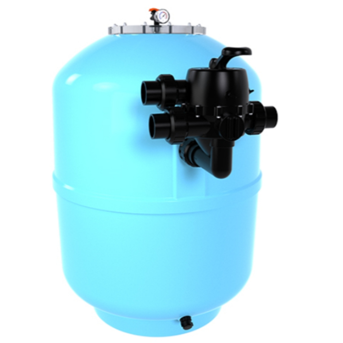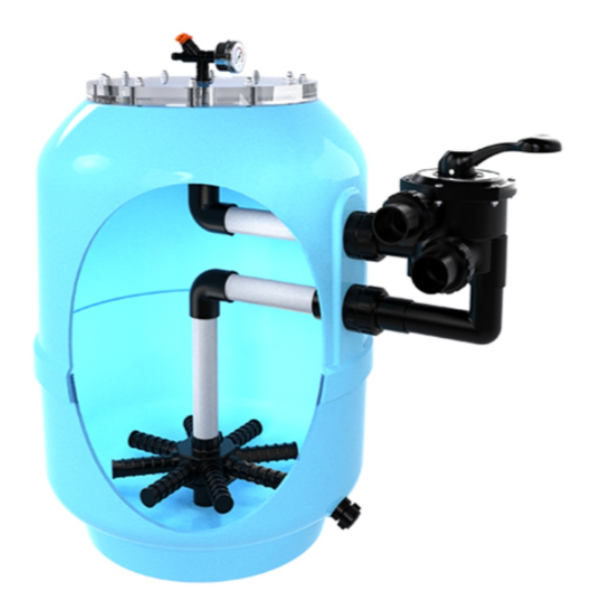 Манометр в верхней части корпуса указывает степень загрязнения засыпки и необходимость ее промывки. В качестве наполнителя необходимо использовать кварцевый песок или стеклянную засыпку AFM. Каждые 8–12 месяцев эксплуатации бассейна необходимо замена песочной засыпки фильтра.