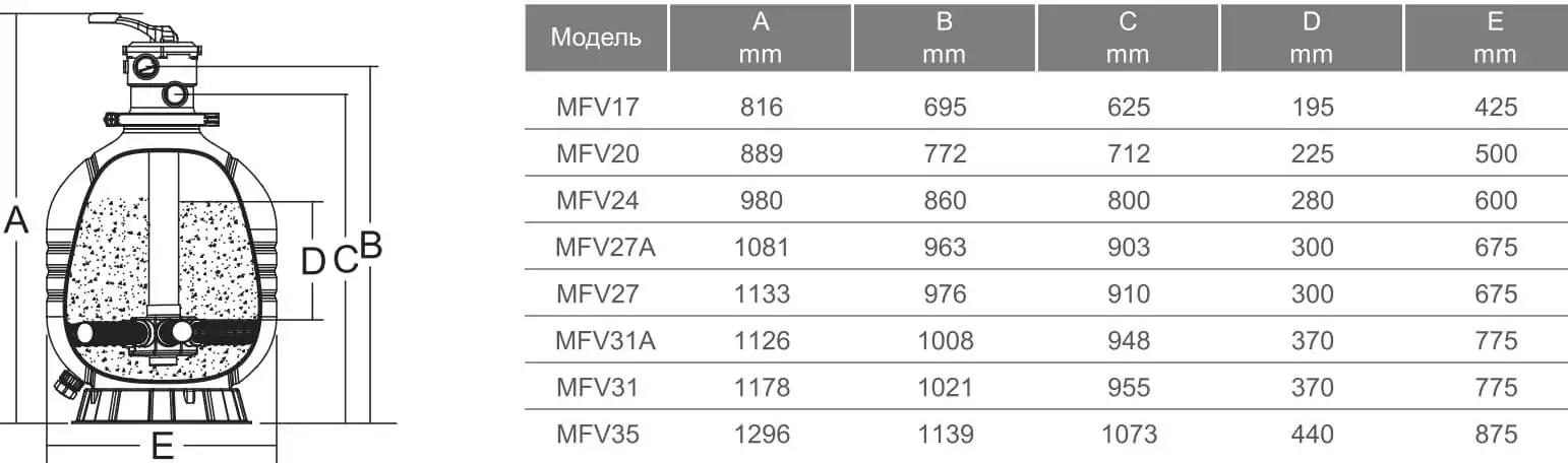 Песчаный фильтр с верхним подключением для проточной очистки воды в частных и общественных бассейнах объемом до 120 м3. Корпус изготовлен выдувным методом формования из полиэтилена. Фильтровальная емкость цельная без стыков и соединений, благодаря чему может выдерживать давление до 2,8 бар. 6-позиционный клапан фиксируется в верхней части емкости на зажимном хомуте, соединение герметизируется резиновым кольцом. После снятия клапана можно загрузить или обновить фильтрующую засыпку.