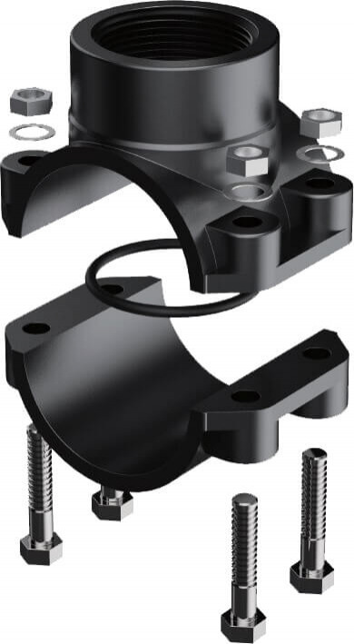 Такой хомут позволит быстро и надежно, а главное герметично врезаться в существующею обвязку ПВХ труб. Это осуществляется благодаря устройству хомута, состоящего из двух скрепляющихся между собой частей с уплотнительным резиновым кольцом.