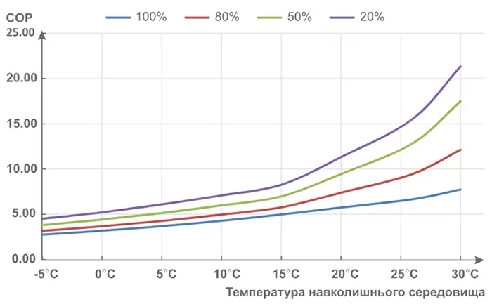 Коэффициент эффективности - показывает соотношение полученных кВт тепловой мощность к затраченному 1 кВт электроэнергий. Выше COP - лучше энергоэффективность.