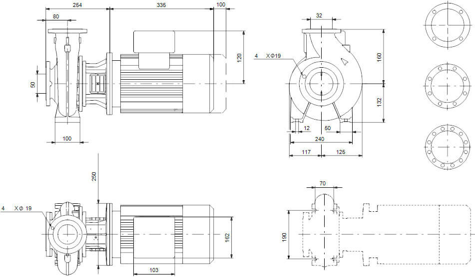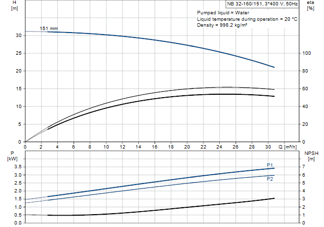 Фланцы в насосах PN 16 с размерами в соответствии с EN 1092-2. Данный насос имеет осевой всасывающий канал, радиальное выпускное отверстие, горизонтальный вал и задний выдвижной дизайн, позволяющий удаление двигателя, мотора стула, крышки и рабочего колеса, не нарушая целостности корпуса насоса или трубопроводов. Grundfos NB 32-160/151 AF2ABQQE моноблочный насос монтируется с асинхронным двигателем с вентиляторным охлаждением.