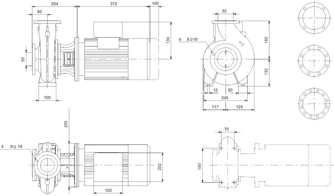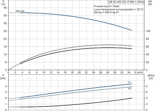 Фланцы в насосах PN 16 с размерами в соответствии с EN 1092-2. Данный насос имеет осевой всасывающий канал, радиальное выпускное отверстие, горизонтальный вал и задний выдвижной дизайн, позволяющий удаление двигателя, мотора стула, крышки и рабочего колеса, не нарушая целостности корпуса насоса или трубопроводов. Grundfos NB 32-160/151 AF2ABQQE моноблочный насос монтируется с асинхронным двигателем с вентиляторным охлаждением.
