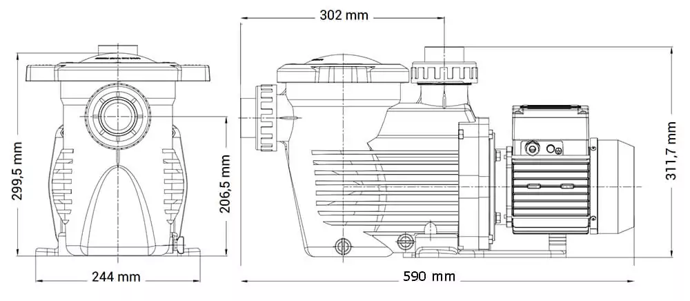 Насос с префильтром для циркуляции воды в системе фильтрации бассейна или искусственного водоема объемом до 30 м3. Гидравлический блок устройства изготовлен из прочного термопластика. Насос может быть использован в водоемах с соленой/морской водой. Вал из нержавеющей стали марки 316 и крыльчатка из Noryl устойчивы к агрессивной среде.
