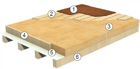1. Чистовое покрытие пола (ламинат) 2. Черновое покрытие пола (шпунтовая доска) 3. Теплоизоляция ISOVER Каркас-М40 4. Лаги 5. Пароизоляционная мембрана ISOVER VS 80 6. Несущее основание |