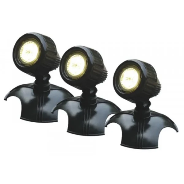 Светодиодный прожектор для пруда придаст очаровательный вид искусственному водоему. Комплект состоит из 3 LED прожекторов. Каждый из прожекторов оснащен 3 энергосберегающими светодиодами LED мощностью 3 Вт. Цвет светодиодов – белый.