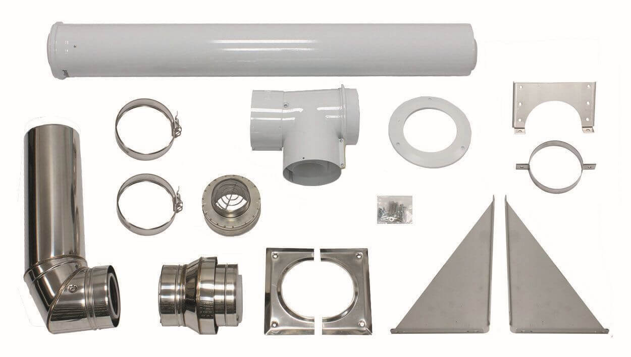 Коаксиальный дымоход является необходимым элементом для обеспечения эффективной и стабильной работы системы отопления в целом, а так же возможно получить максимальный эффект благодаря такому комплекту при этом затрачивая минимальное количество топлива. Комплект подходит для горизонтального прохода как сквозь стену.