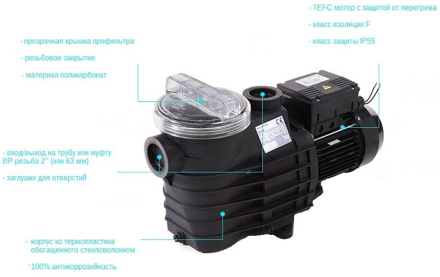 Циркуляционный насос для системы фильтрации в частных и общественных бассейнах объемом до 120 м3. Блок префильтра защищает гидроблок от попадания крупного мусора на рабочее колесо и вал, исключая возможность их деформации или износа. Префильтр закрыт прозрачной крышкой для легкого контроля загрязнения. Крышка легко откручивается руками дополнительный инструмент для чистки префильтра для требуется.