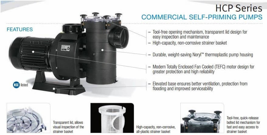 Центробежный насос моноблочного типа с префильтром для циркуляции воды в системе фильтрации бассейнов объёмом до 420 м3. Отличительной особенностью профессиональной серии насосов HCP является гидравлический блок и префильтр, изготовленный из термопластика, армированного стекловолокном, и крыльчатка из Noryl.