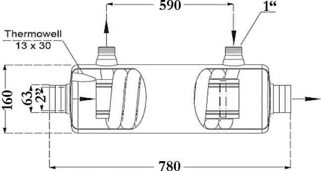 Теплообменник имеет нержавеющий корпус, внутри которого расположен нагревательный элемент в виде спирали. Вода из бассейна благодаря насосу системы фильтрации поступает в теплообменник. Благодаря контакту воды со спиралью тепловая энергия теплоносителя передается воде бассейна - вода в бассейне нагревается.