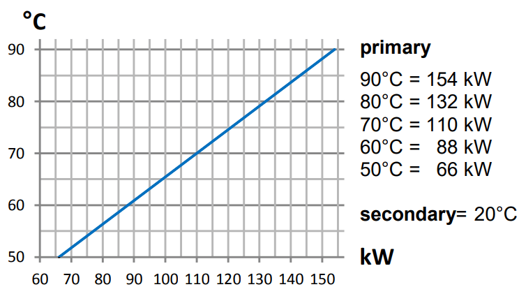 Мощность теплообменника при 90° - 132 кВт. Мощность теплообменника при 60° - 75 кВт.