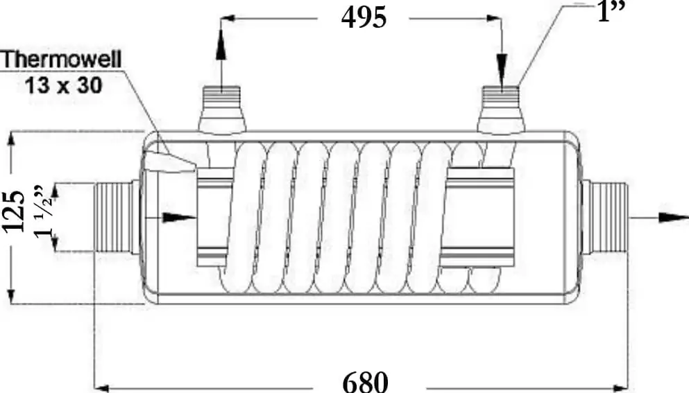 Теплообменник работает в паре с термостатом и циркуляционным насосом. Если температура воды в бассейне превышает установленное пользователем значение, то на термостате, срабатывает автоматическая блокировка подачи воды в теплообменник.