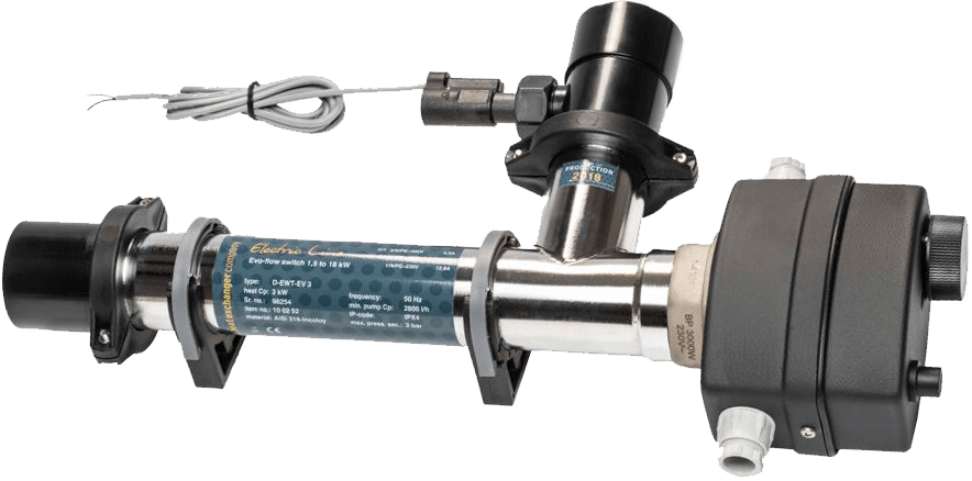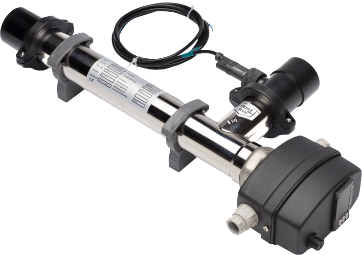 Корпус нагревателя изготовлен из нерж. стали марки 316а, максимально надежный и устойчивый к повещённой влажности и химическим реагентам дезинфекции бассейнов. Нагревательный элемент изготовлен из сплава Incoloy 825. Работа тэна управляется механическим термостатом на корпусе. Защиту от перегрева корпуса и тэна обеспечивает датчик перегрева и встроенный датчик протока.