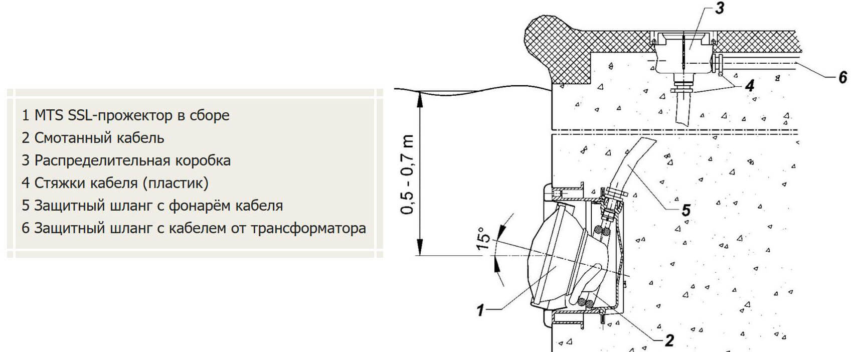 Прожектор поставляется в комплекте с кабелем длиной 3 м и закладной деталью.