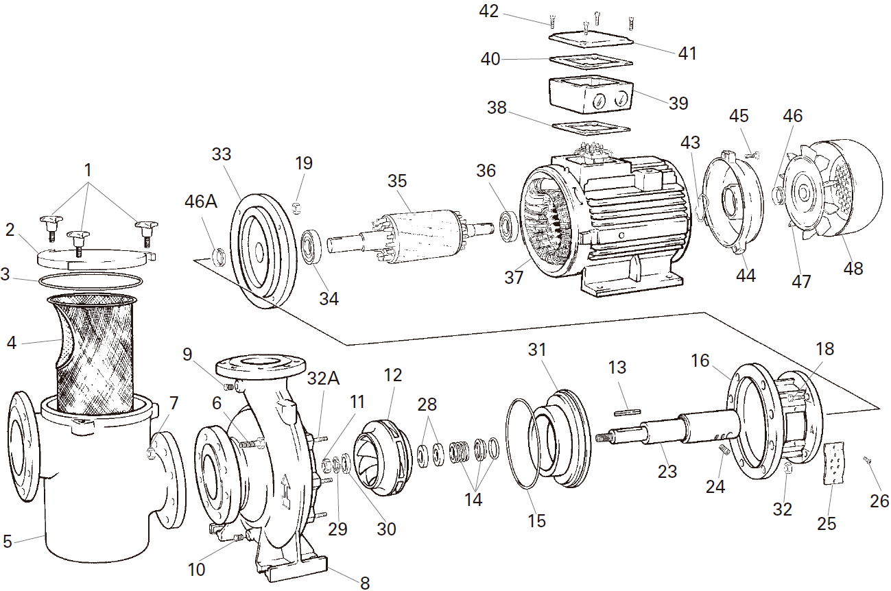Префильтр увеличенного размера крепится к моторному блоку надежным фланцевым соединением. Корзина грубой очистки изготовлена из нержавеющей стали AISI-316. Крышка корзины чугунная, фиксируется тремя откидными винтами, с ручной насадкой. Для снятия крышки не требуется инструмент.