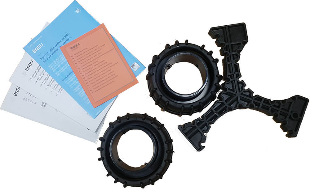 Моторный блок и гидравлический соединены между собой материалами, не проводящими электричество, без гальванической связи, что защищает вал двигателя от агрессивной среды и коррозии. Такая конструкция обеспечивает безопасность эксплуатации для оператора, в помещениях с повещённой влажностью. Разборные соединительные муфты для подключения к трубопроводу поставляются в комплекте.