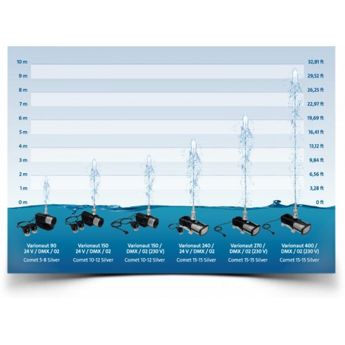 Varionaut 270 / DMX / 02- это водяной насос, который отлично подходит для создания фонтана. Устройство включает префильтр из нержавеющей стали, а также источник данных DMX/RDM. Благодаря фирменной технологии можно одновременно управлять и насосом и освещением. Каждые 30 секунд отправляется обратный сигнал с полными данными о состоянии устройства на пульт дистанционного управления. Насос отвечает всем требованиям безопасности, благодаря чему он может быть установлен в фонтанах в общественных местах.