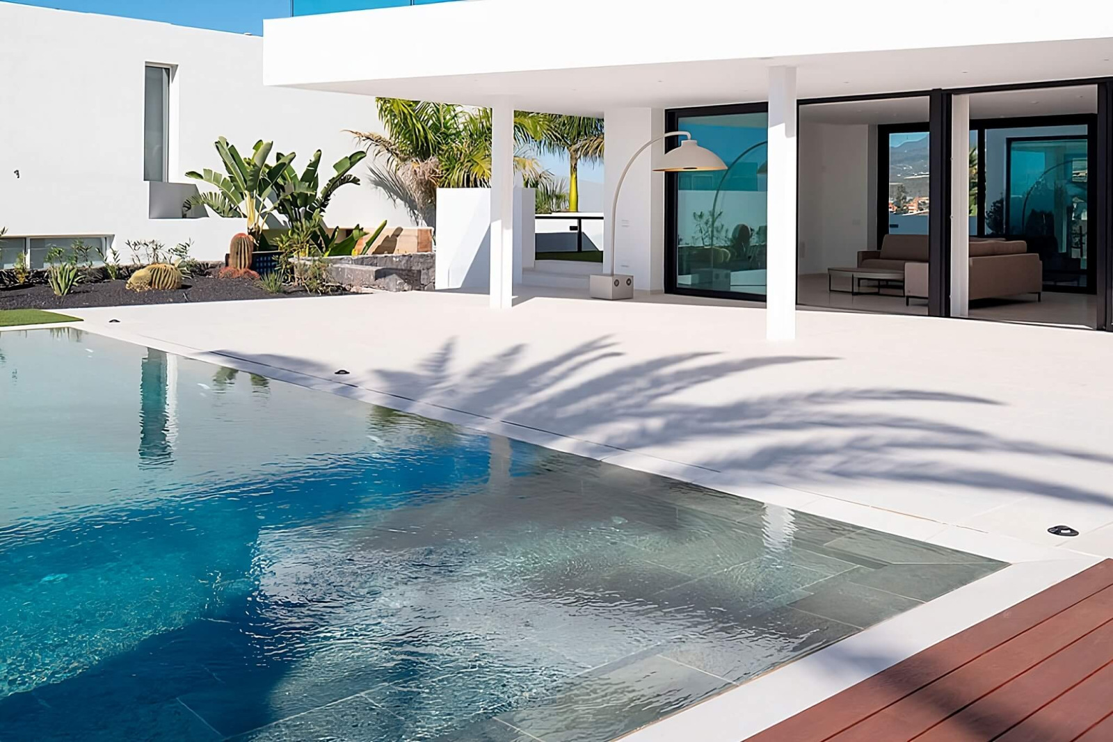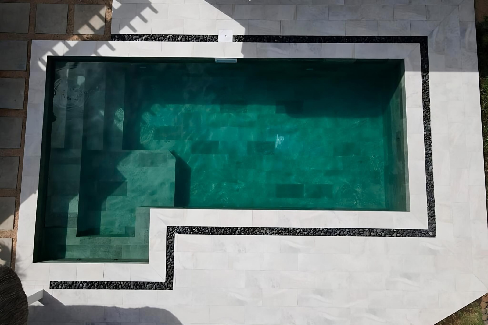 Бортовая плитка из керамогранита отлично переносит воздействие ультрафиолета, химикатов для очистки бассейна и выдерживает физическое влияние. Может устанавливаться практически без стыков. Образует вокруг бассейна небольшой бортик, который препятствует попаданию загрязненной воды назад в водоем.