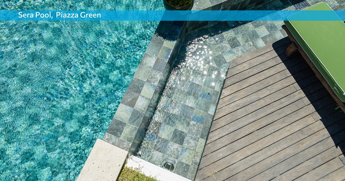 Серия Sera Pool Piazza отличается спокойным, упорядоченным дизайном с равномерным каменным рисунком без резких контрастов, что придаёт поверхности аккуратный и современный вид. Оттенок Piazza Green формирует в бассейне чистый зелёно-бирюзовый цвет воды, создавая ощущение свежести и визуальной прозрачности. Плитка выпускается в двух форматах, что позволяет подобрать оптимальное решение под конкретный проект.