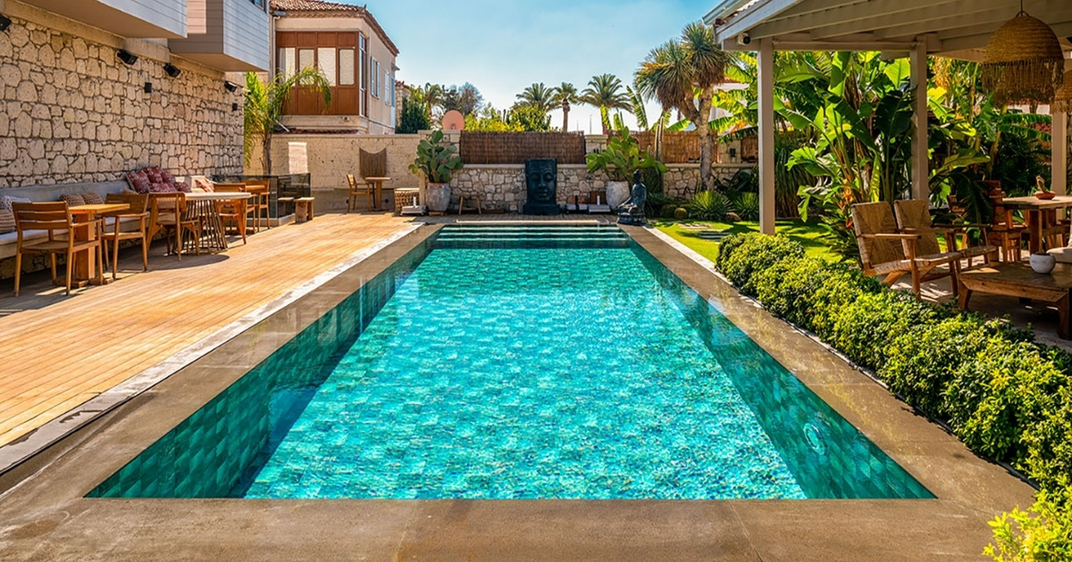 Плитка формата 33 × 66 см визуально разделена на 8 сегментов с имитацией швов, благодаря чему создаётся эффект укладки мелкой плитки размером около 16,5 см. При этом фактически используется одна крупноформатная плитка, что позволяет сохранить эстетику мозаичной раскладки. Такое решение значительно упрощает и ускоряет монтаж, сокращая количество реальных швов и трудозатраты при облицовке бассейна.