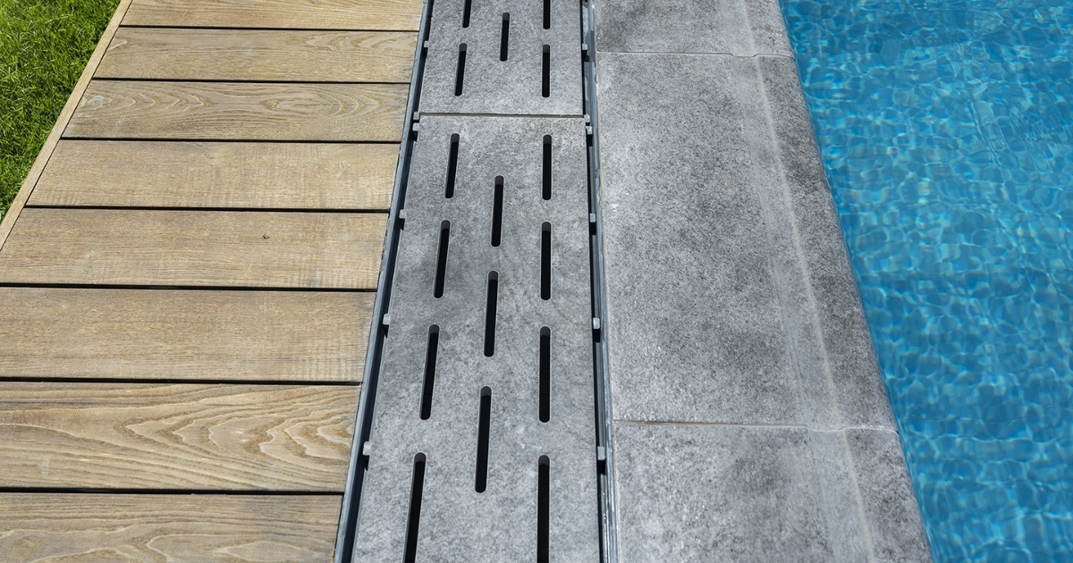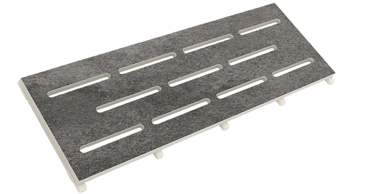 Решётка оснащена равномерными прямыми прорезями, обеспечивающими эффективный и стабильный отвод переливной воды. Прорези имеют аккуратную геометрию, безопасны для босых ног и предотвращают скопление воды на поверхности борта.
