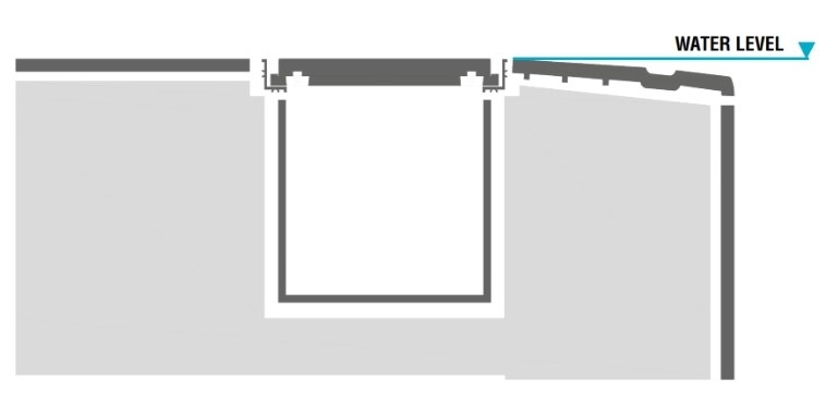 Решётка оснащена равномерными прямыми прорезями, обеспечивающими эффективный и стабильный отвод переливной воды. Прорези имеют аккуратную геометрию, безопасны для босых ног и предотвращают скопление воды на поверхности борта.