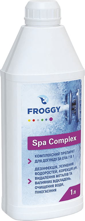 Spa complex Froggy комплексное средство для ухода за водой СПА 1л применяется для дезинфекции, удаления водорослей, коррекции уровня рН, удаления металлов и известковых отложений, а так же для очистки воды и пеногашения. Spa complex Froggy 1 л заменяет вам кучу средств по уходу за водой и в следствии экономит средства и время на растворение многих препаратов для СПА.
