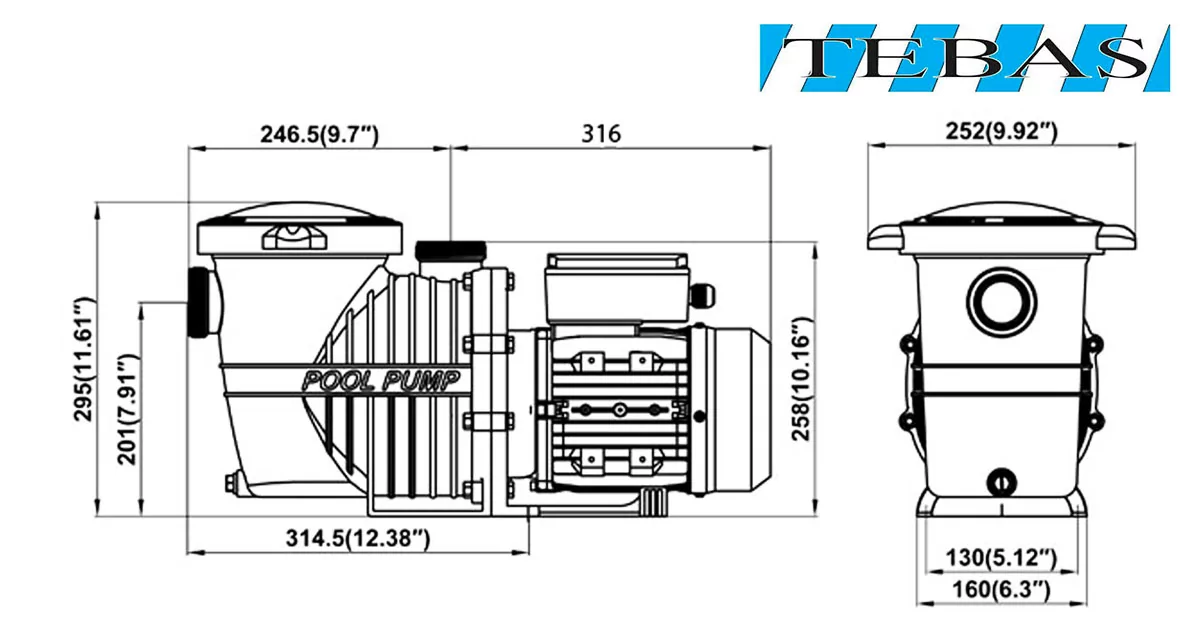 Самовсасывающий циркуляционный насос для системы фильтрации бассейна объемом до 50 м3. Гидроблок устройства защищен префильтром для улавливания крупного мусора из воды. Корзина префильтра закрыта прозрачной крышкой из поликарбоната. Крышка фиксируется двумя откидными фиксаторами на резьбе, вспомогательный ключ входит в комплект поставки.