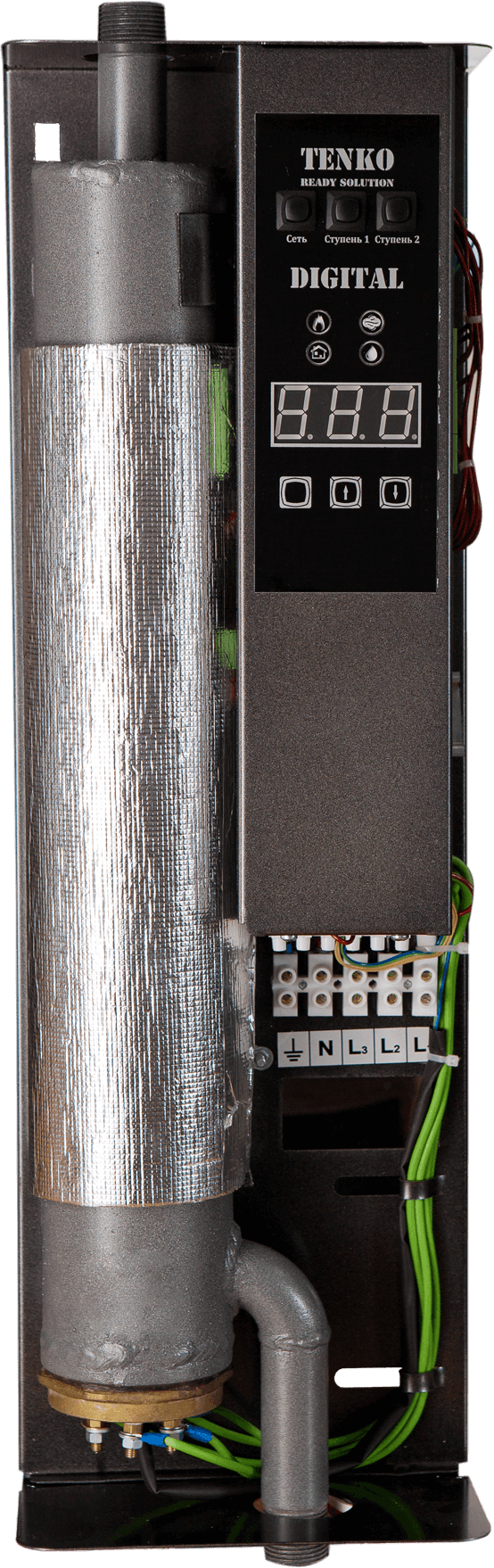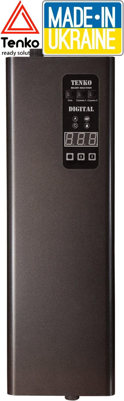 Электрокотел Тенко Digital 9 кВт 380В оснащен полностью электронной панелью управления без механики. Котел украинского производства Тенко Digital 9 кВт 380В работает с максимальным КПД в 99%.