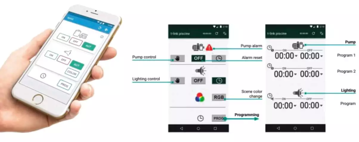 Панель управления оборудованием водоподготовки в частных и общественных бассейнах. Функционал устройства включает в себя возможность управления системой фильтрации, циркуляции, освещения и дополнительными аттракционами бассейна. Благодаря встроенному модулю bluetooth, контроль работы блока управление может осуществляться с Вашего смартфона с помощью приложение T-link Piscine App.