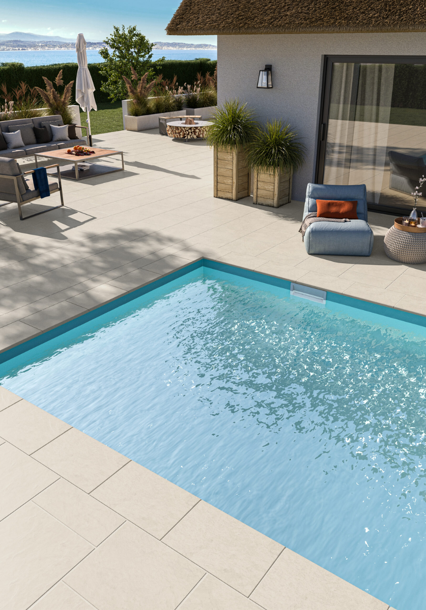 • Не нагрівається на сонці завдяки світлому відтінку та високій теплоємності матеріалу.