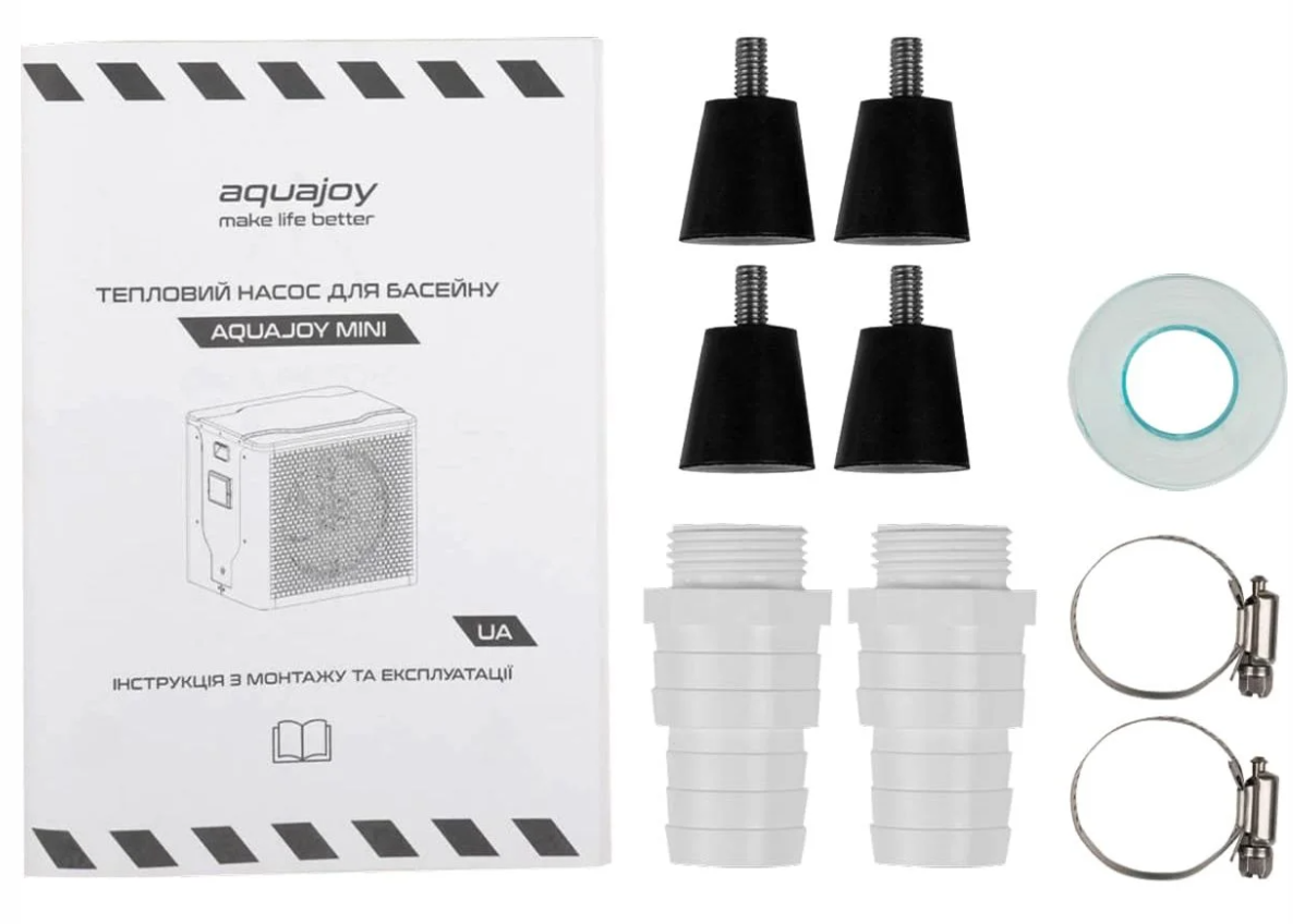 Комплектація: тепловий насос, перехідники для підключення (32/38 мм); кабель живлення; опорні ніжки з антивібраційними вставками.