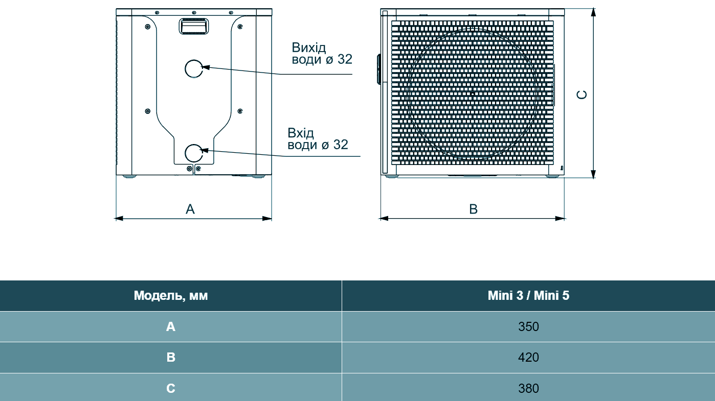 Компактний тепловий насос для басейну об'ємом 15 м3. Керуйте телефоном як можна з панелі, так і дистанційно через Wi-Fi та додаток AQUA TEMP (Android, iOS).