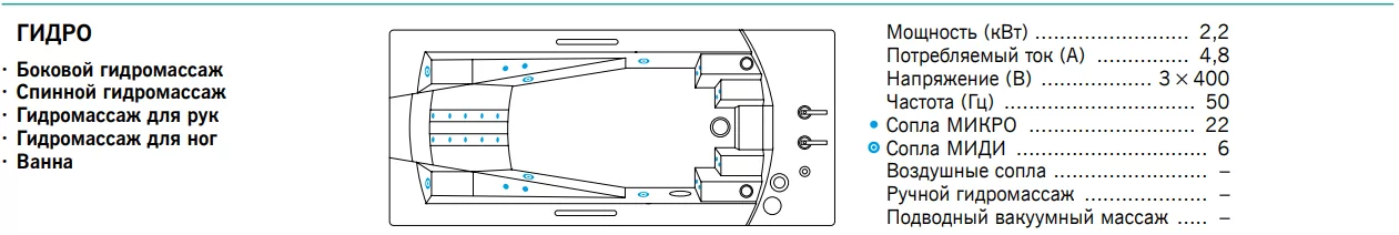 В базову комплектацію ванни входять: ванна, рама з регульованими ніжками, бічні декоративні панелі корпусу, пристрій слива, крани заповнення холодною і теплою водою, змішувач з ручним душем, рукоятки з нержавіючої сталі.