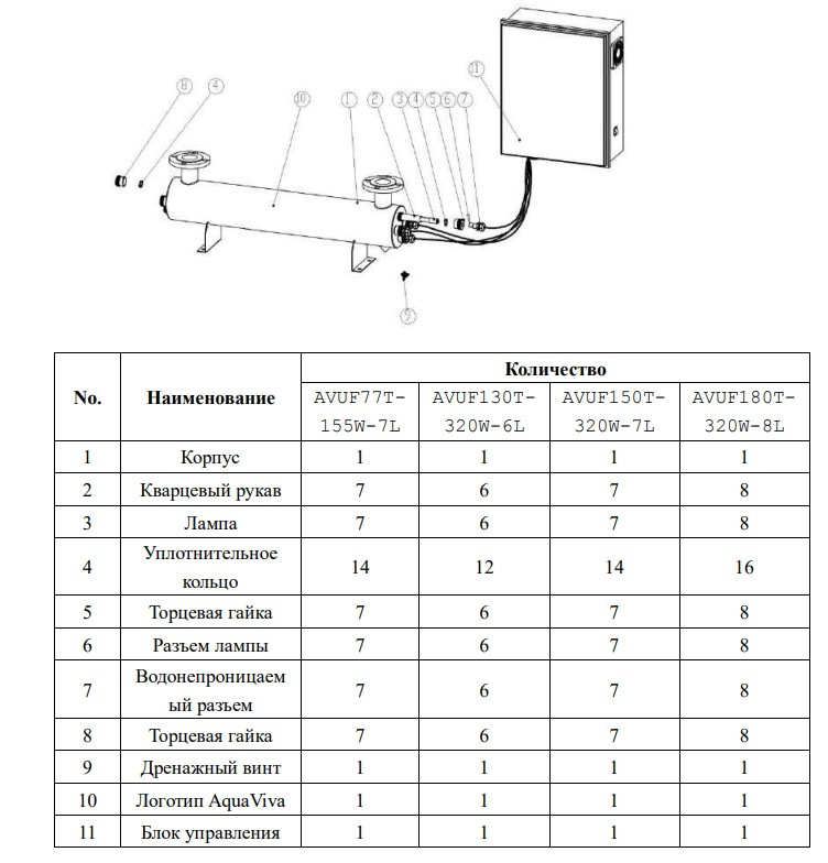 AquaViva AVUF180T DN200, 2.65 кВт Ультрафіолет для басейну – система (низького тиску) дезінфекції води у басейнах громадського користування об'ємом до 250 м3. Ефективно знезаражує воду шляхом швидкого руйнування небажаних органічних елементів у воді басейну на клітинному рівні завдяки УФ-С-опроміненню (l = 254нм), яке добре поглинає ДНК усіх мікроорганізмів та вірусів. Це поглинання призводить до руйнування генетичної структури ДНК. Мікроорганізми та віруси біологічно інактивуються, тому викид у 254нм підходить для цілей дезінфекції якнайкраще. У цій установці використовується лампа Аммальгам Lightsources. Це лампи низького тиску і високої енергоефективності. Технічний опис: Реакторна камера: сталь AISI 304 L Кількість ламп: 8 шт (по 320 Вт) Термін служби лампи – 12000 годин Робочий тиск: 0,6 МПа Довжина хвилі: 254 нм Лампи: USA Lightsources Загальна потужність: 2650 Вт Напруга живлення: 110-120 В/60 Гц, 220-240 В/50 Гц Коефіцієнт пропускання кварцової втулки: 92% Температура води: 4 - 50°C Бактерицидна ефективність: до 99% Блок управління: індикатор стану, звуковий та візуальний сигнал тривоги З'єднання: вхід/вихід DN125 Комплектація: УФ встановлення Блок управління Фурнітура Інструкція