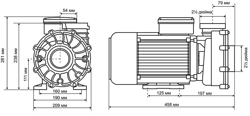 Насос без префільтра для напірної подачі води в системах протитечії, фонтанах, водних атракціонах та гідромасажах. Гідроблок виготовлений із термопластику, мета кріплень посилені ребрами жорсткості. Відмінна риса моделі – висока продуктивність при однофазному підключенні, актуальна для об'єктів, де відсутня можливість трифазного підключення.