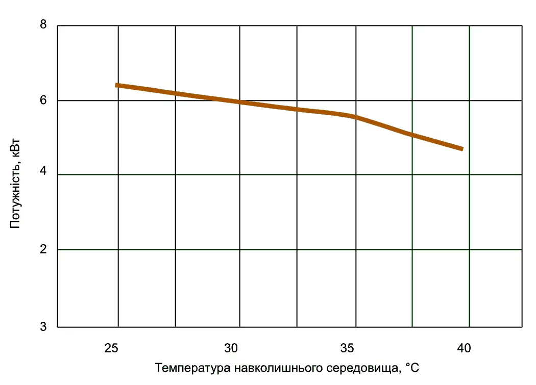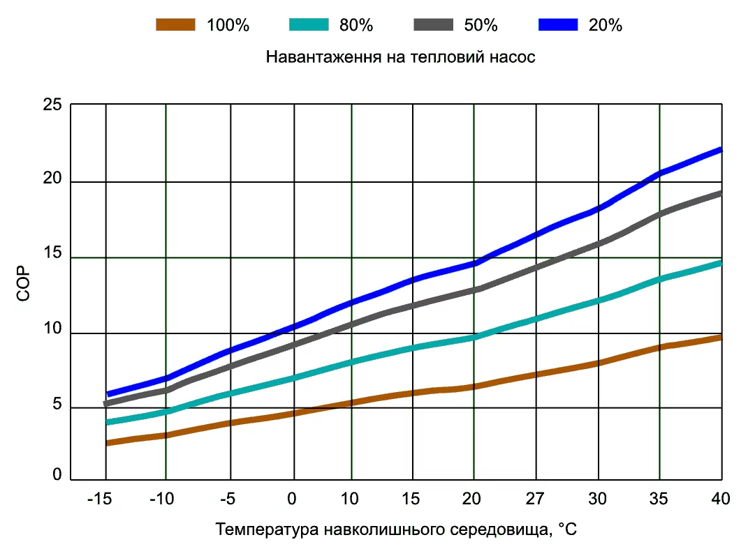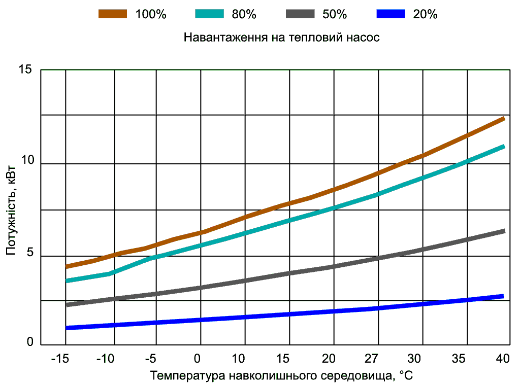 Графік, який показує, як змінюється теплова потужність (теплопродуктивність) та ефективність (COP) теплового насоса в залежності від температури навколишнього середовища.