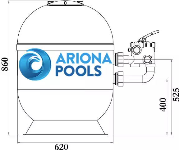 Бічне підключення 6-позиційного клапана та трубопроводу дозволяють встановлювати фільтр у технічних приміщеннях з невеликою висотою. Для заповнення фільтруючим матеріалом у верхній частині корпусу встановлена прозора кришка на різьбовому з'єднанні з гумовим ущільнювачем. Прозора кришка забезпечує зручний контроль рівня засипки та її стану.