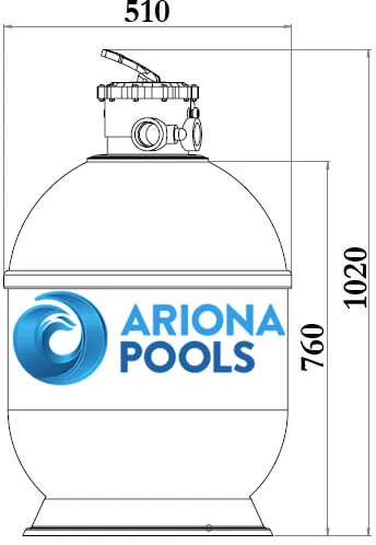 Пісочний фільтр для басейну з ємністю із ламінованого пластику, посиленого скловолокном. Верхнє підключення трубопроводу та 6-позиційний клапан. Надійне з'єднання ємності фільтра та клапана болтами, ущільнене гумовою прокладкою. Зовнішню частину пристрою захищено від УФ спеціалізованим лаком. У нижній точці фільтрувальної ємності встановлена зливна горловина для осушення засипки перед заміною або підготовки фільтра до зимівлі.