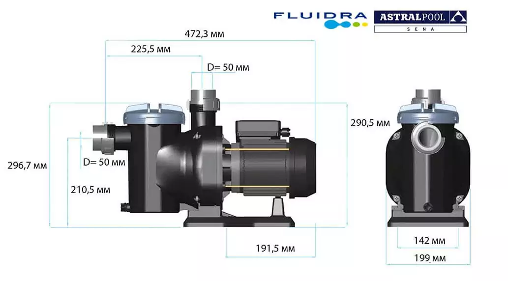 Циркуляційний насос для басейну від іспанського бренду Astral Pool/Fluidra. Серія Sena використовується у приватних та малих громадських басейнах. Насос укомплектований префільтром (фільтр грубої очистки) для безпечної роботи із забрудненою водою. Самовсмоктувальний насос виробник рекомендує встановлювати на рівні не більше ніж 2 метри над рівнем води. Припустимо застосування в басейнах з морською/солоною водою.