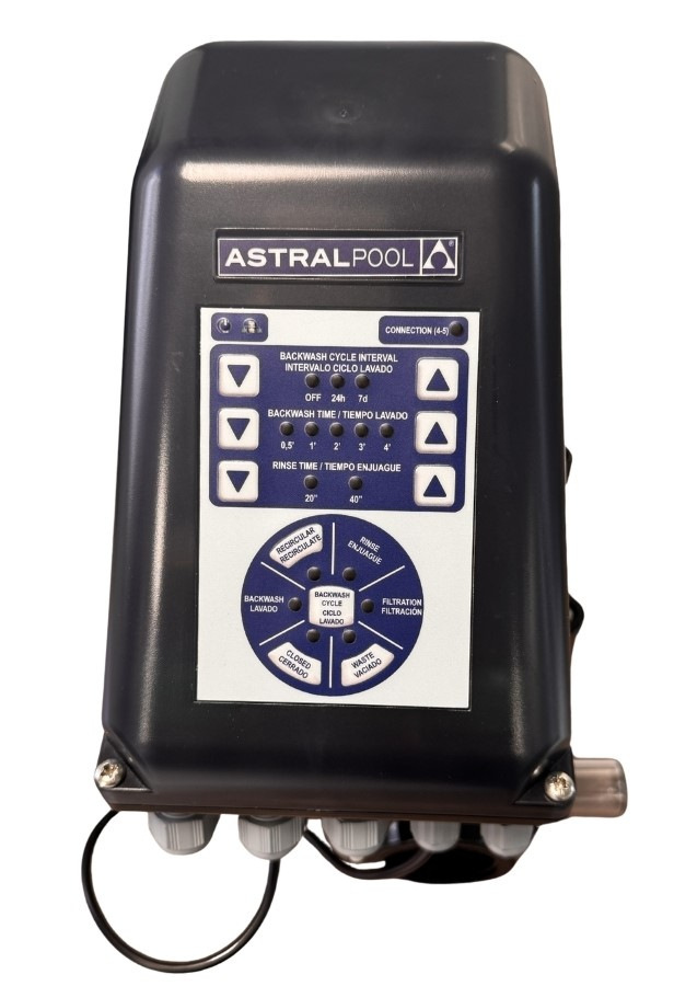 Автоматичний багатопозиційний клапан призначений для автоматизації роботи системи фільтрації води у басейні. Він дозволяє керувати основними режимами роботи фільтра без необхідності постійного ручного перемикання.