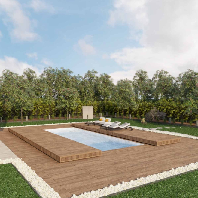 Aguard Slide Mirror Y - це автоматична тераса, що засовується, яка стане ідеальним варіантом покриття вашого басейну. Тераса призначена для покриття басейну будь-якої форми завширшки до 5 метрів, завдовжки до 10 метрів. Вона виготовлена з міцних до механічних впливів та стійких до корозії матеріалів, нержавіючої сталі та дошки для терас. Конструкція перешкоджає попаданню у воду ультрафіолетового випромінювання, сміття, а також запобігає втраті поди шляхом випаровування. У разі виникнення будь-якої перешкоди тераса припиняє рух. Ціна за конструкцію вказана без вартості обшивки. Керування пристроєм можливе зі смартфона у віддаленому режимі.